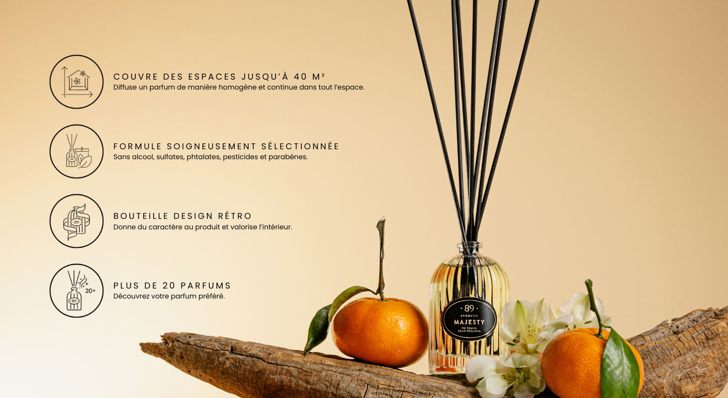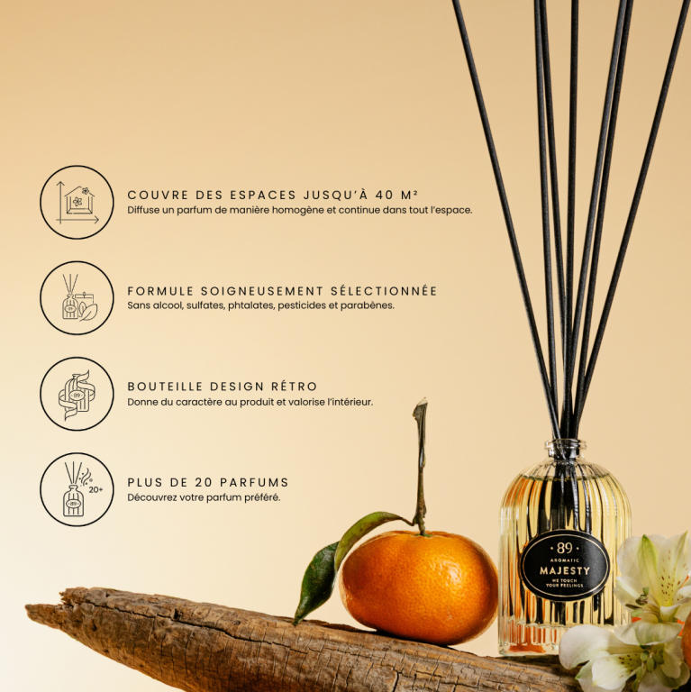 Il vous suffit de placer les tiges dans le flacon et de laisser le parfum se diffuser naturellement. Ajustez l’intensité en ajoutant, retirant ou retournant les tiges.